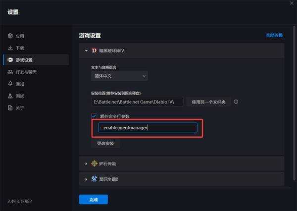 (4)在战网客户端——>游戏设置——>暗黑破坏(huai)神4——>勾选额外(additional)命令行参数,添加(tianjia)下列参数后点击达成按鈕:-enableagentmanager(注意這個-前面要加一个(yige)空格)