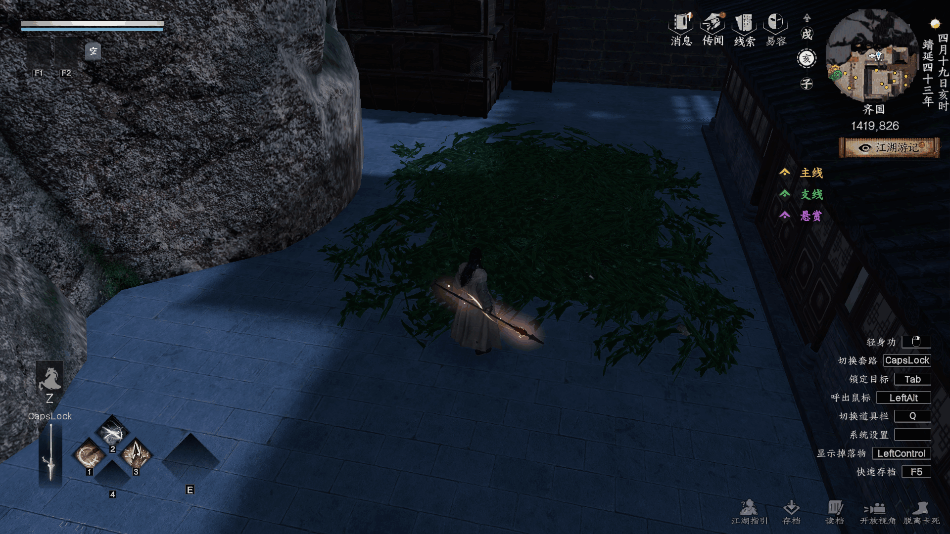 技能(jineng)卷:来到1112.1481交谈万事通今儿天气可真不错啊,继續交谈云鹤村传闻打坐等飞鸽,收到(receive)飞鸽后来到1057.1525交互茅草堆獲得长兵悟卷使用獲得技能(jineng)风平浪静