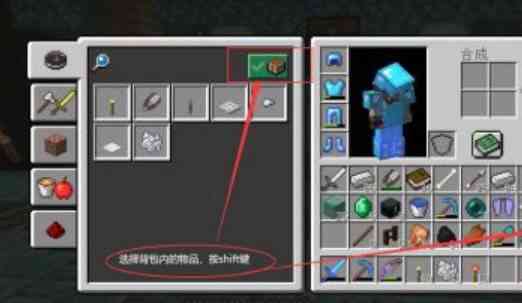 然後选(xuan)择(ze)你想放入箱子的物品,按住shift键就可以快速地把物品放到箱子中了。