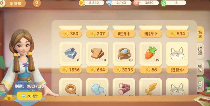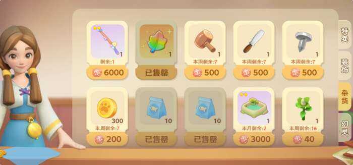 7.图一图九图十图十一,杂货店需要购买的内容为:特卖区清空与订单相关且需要时间制作的材料(种植小麦甘蔗不算,具体原理翻阅第二篇第一篇),杂货区鱼饵玲珑,幻灵区头像,在满足以上(shang)要求后,可以额外购买建筑增加繁荣度。