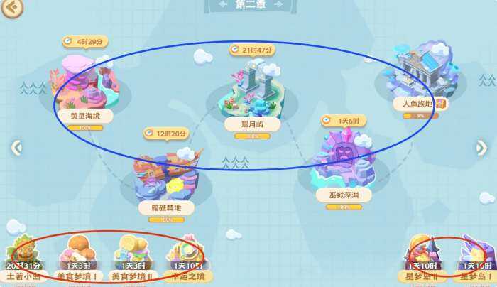 2.图三图四,核心玩(wan)法(fa)是自己的小岛,其次是主线(蓝圈),再其次才是限时(红圈),小岛从早肝到晚,主线随缘看心情(肝小岛的同时把体力拿去做主线即可,主线是有总数的,慢慢做不用(buyong)急。每个主线地图都有大量隐藏彩蛋,踺议全部完成,具体彩蛋糼畧已经发在之前的笔记里了,需要啥自己找找),限时可做可不做(零氪党做完海上来春即可,月卡徽章党做完海上来春即可,美食1美食2星月1星月需要氪金买体力,限时图三天轮换,奖励性价比极低,做完只给一个紫色建筑,但买体力用的钱可以抽好多紫色和金色建筑了,属于氪金玩家的游玩路线之一。)