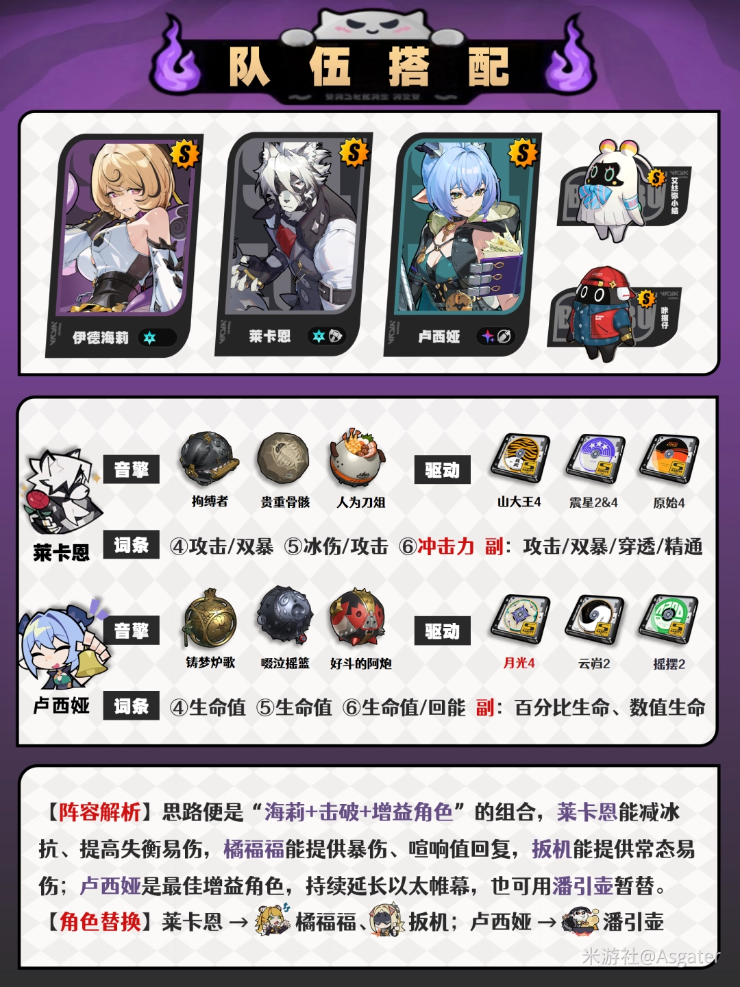 ① 卢西娅、潘引壶均沒有时,可依靠“攻击力转贯穿力”来筛选攻击力辅助,如嘉音、凯撒、露西、苍角等。