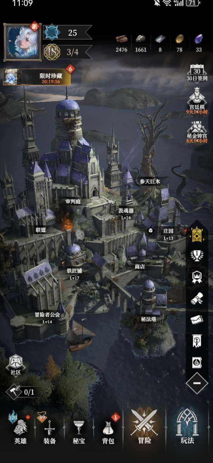 建筑升级顺序:招魂塔>庄园(资源生产核心)>铁匠铺(提升裝備品质)>冒险者公会,其中公会升至18 级可每日接 12 个任务,单日收益达 6000 点;