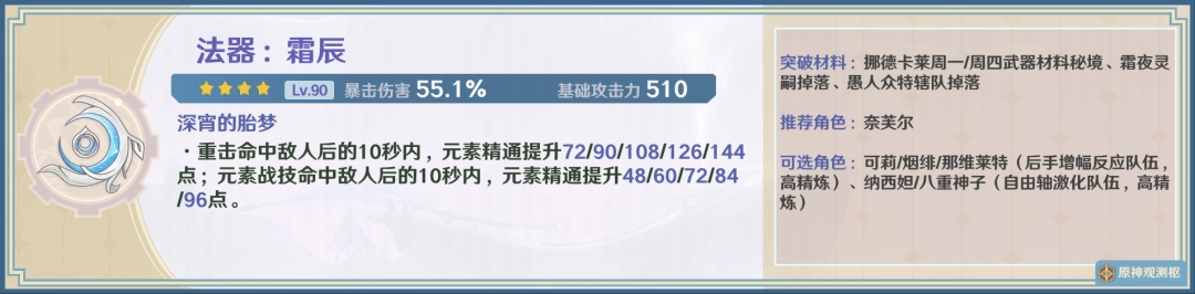2.3.纳西妲、八重神子在可以自由施放重击的激化队伍(duiwu)中,高精霜辰在四星武器中较为优先,但有队伍(duiwu)与手法限制(xianzhi)。