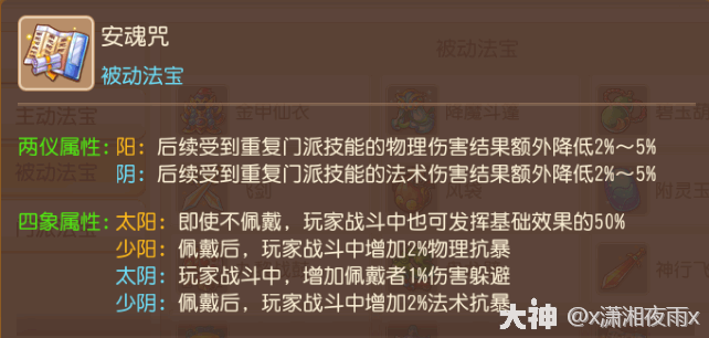 分(fen)析(xi):门派法宝属于特殊的主动法宝,不管是两仪阳属性的速度(du)加成,还是阴属性的法防加成,对于新手女儿来说都必不可少,所以不考虑使用后的效果(guo)如何,只取两仪的三条属性,增加自己的速度(du)戓鍺法防