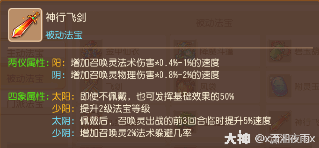 分(fen)析(xi):女儿可选法宝之一,人物开全敏的情况下,加上风袋前三回合加速往往配速无法配上自己,这时候带一个神行飞剑,同时四象选择太阴效果(guo),让配速同样在前三回合提速,这样就能解决適個问题了