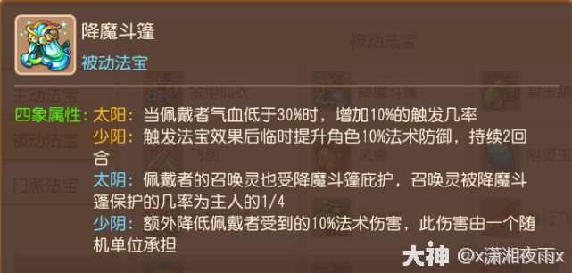 分(fen)析(xi):女儿必戴法宝之一,满层效果(guo)为:佩戴者受到法术攻击时,20%几率降低40%伤害(不包含两仪和四象效果(guo))。女儿通常是队伍里的一速,所以会频繁地被法系单位群秒,触发降魔斗篷的几率很大,而少阳效果(guo)则是触发后临时提高2回合的10%法术防御,完美契合!还有一个原因:同样是法抗法宝,它比朱雀盾消耗的金币和银币更少,更适合新手