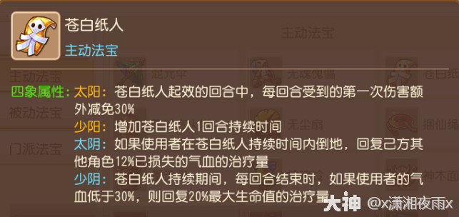 分(fen)析(xi):新手女儿的主动法宝首选苍白纸人,少阴能够在回合结束时对于残血目标回复20%最大生命的治疗量,非常适合女儿被封杀倒地时,当回合无法使用门派技能(neng),龟速拉起来后可选择少阴纸人保命,同时在单人PK中面(mian)对输出也有一定的使用率。它也是解锁门派法宝的四个前置法宝之一,所以不管怎样都得升满它