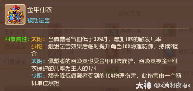 法宝效果(guo):战斗中使用,使自身在3回合内减免部分物理和法术伤害
