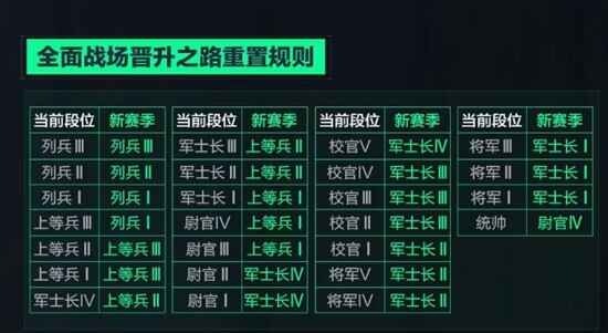 上等兵段位:上等兵Ⅲ和上等兵Ⅱ的玩家(wanjia)将被重置到上等兵Ⅲ段位,而上等兵Ⅰ的玩家(wanjia)将被重置到上等兵Ⅱ段位。