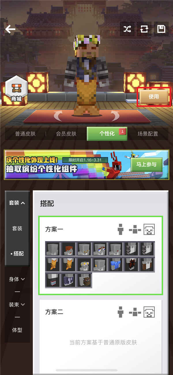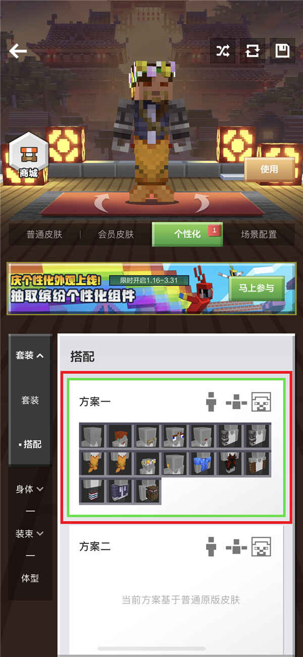 保存好搭配方案后,在“个性化-搭配”标签中,可选(xuan)择(ze)已保存的搭配方案。
