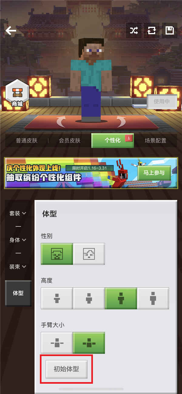 点击“体型”标签,可选(xuan)择(ze)性别与体型,提供不同(different)性别、高度、手臂大小,点击“初始体型”即可(ke)恢复初始设定。