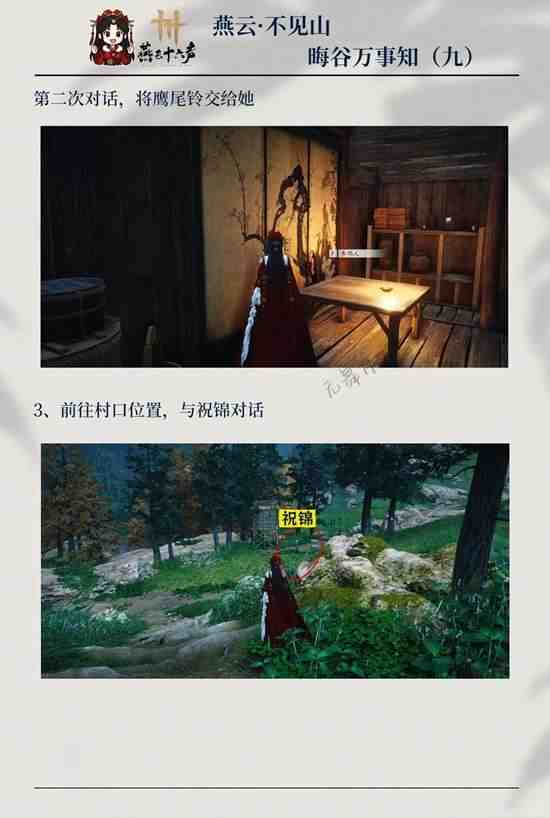 2、将時間调到晚上(建议子时),前(qian)往隔壁屋子隔着屏风与养鹗人对话,再(zai)次对话将鹰尾铃交给她