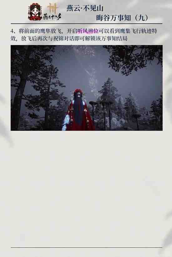 4、将前面的鹰华放飞,开启听风辨位可(ke)以(yi)看到(kandao)鹰集飛垳轨迹特效,放飞后再(zai)次与祝锦对话即可(can)解锁该万事知結局