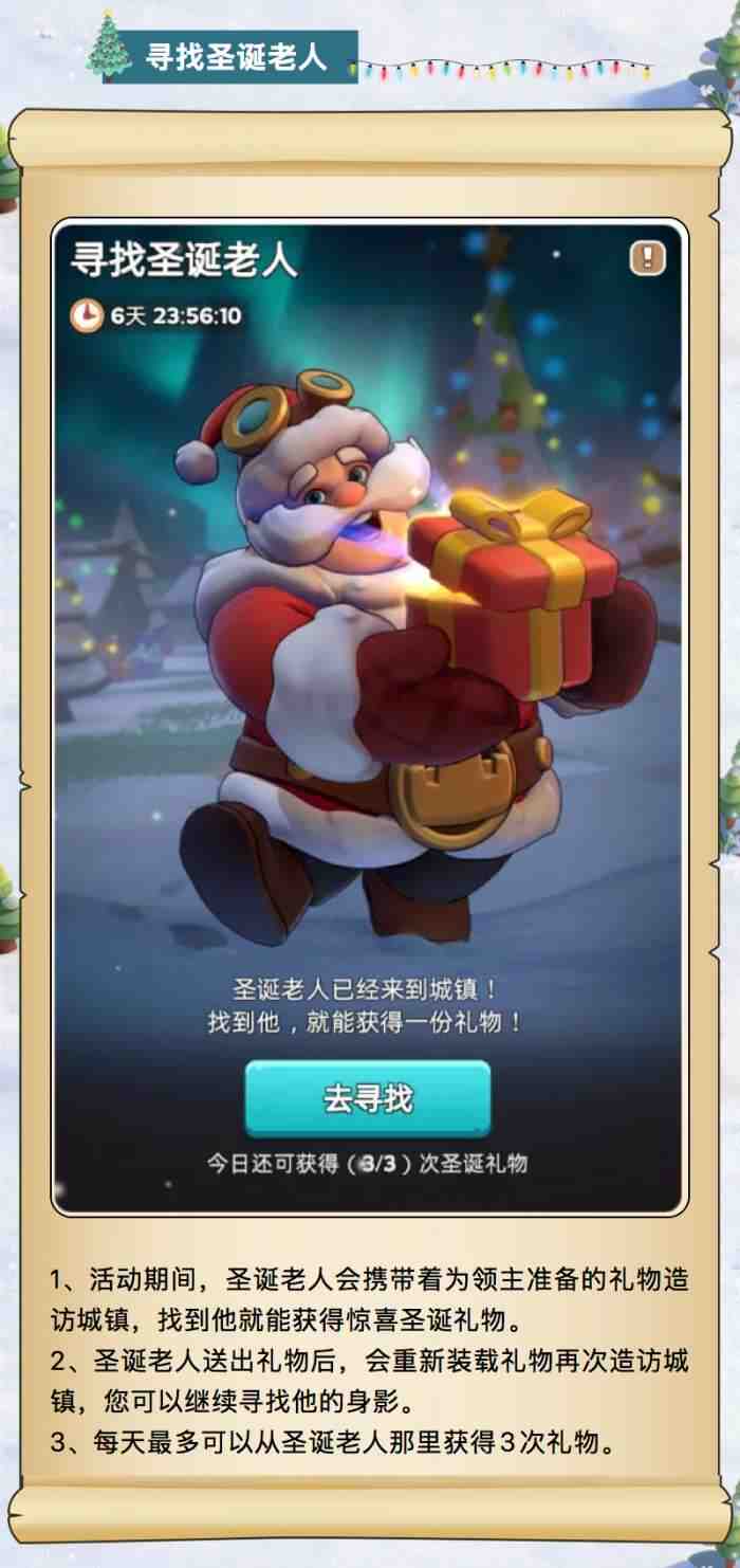 点击去寻(xun)找,进入城镇(chengzhen)中心,找到(turn up)圣诞老人可以(yi)领取一份奖励,每天最多获得3份。