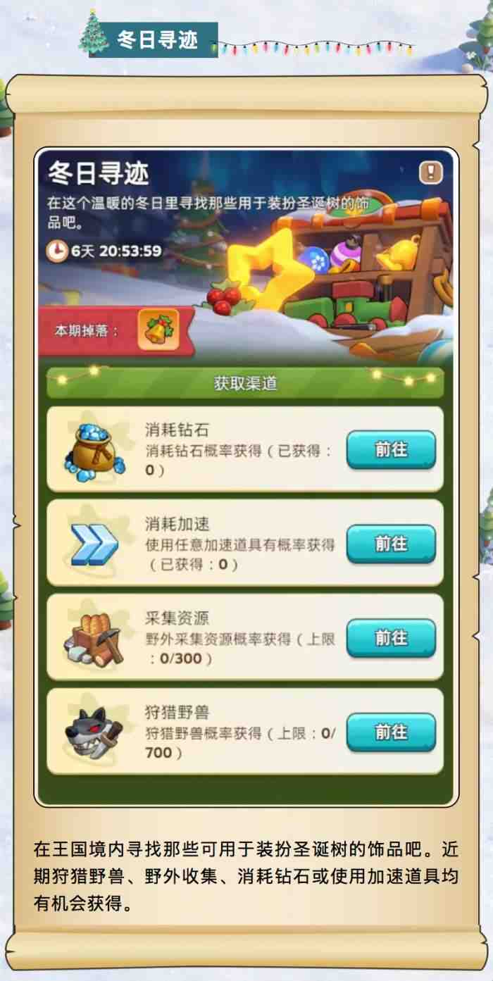 圣诞装饰的其他获取途径:消耗钻石、消耗加速、采集资源、狩猎野兽均可获得圣诞装饰。