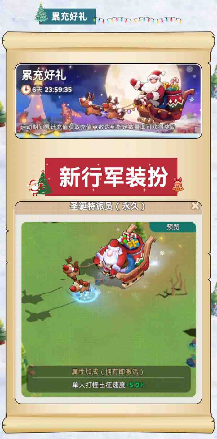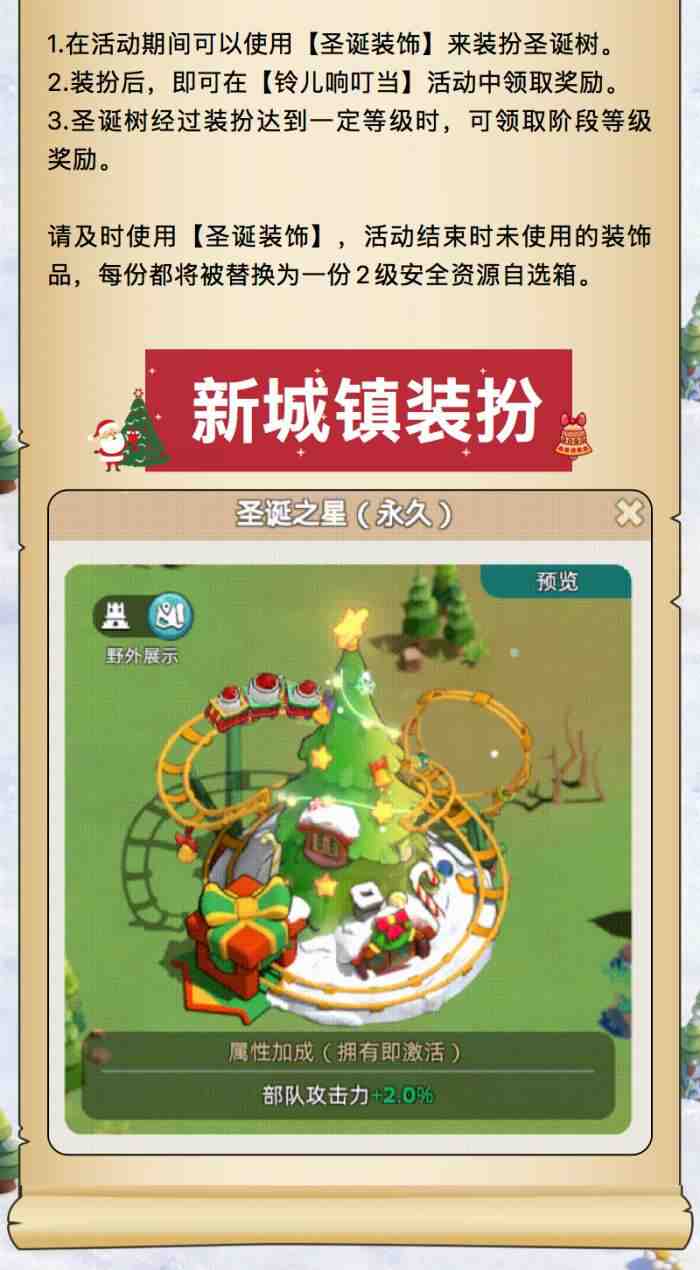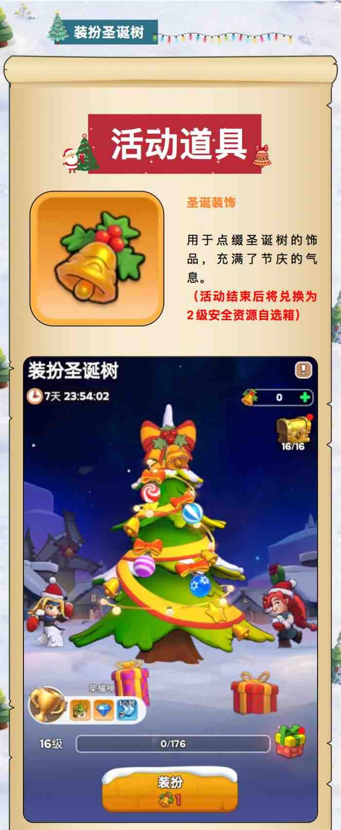 每上交1份“圣诞装饰”可以(yi)获得1-3积分,达到指定分数可以(yi)提升圣诞树等级,并领取该等级的奖励,等级分为2、7、12、16、20、22、24级。