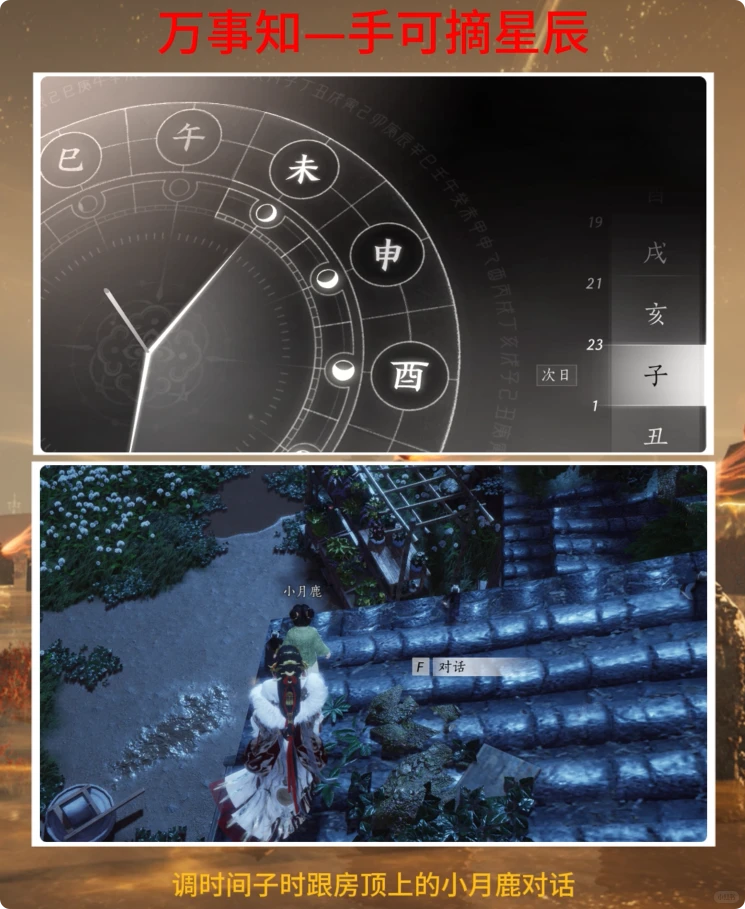 调时间(shijian)子时跟房顶上的小月鹿对话(dialogue)