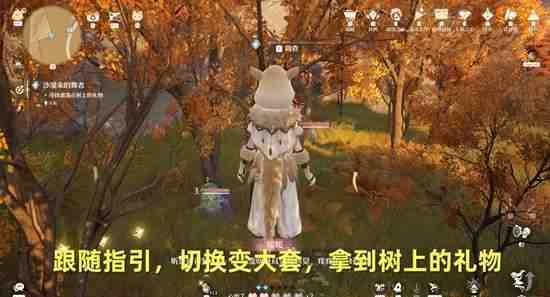 跟随(gensui)指引,找(zhao)到遗落在树上的礼(li)物,我们直接切换变大套,拿到树上的礼(li)物;