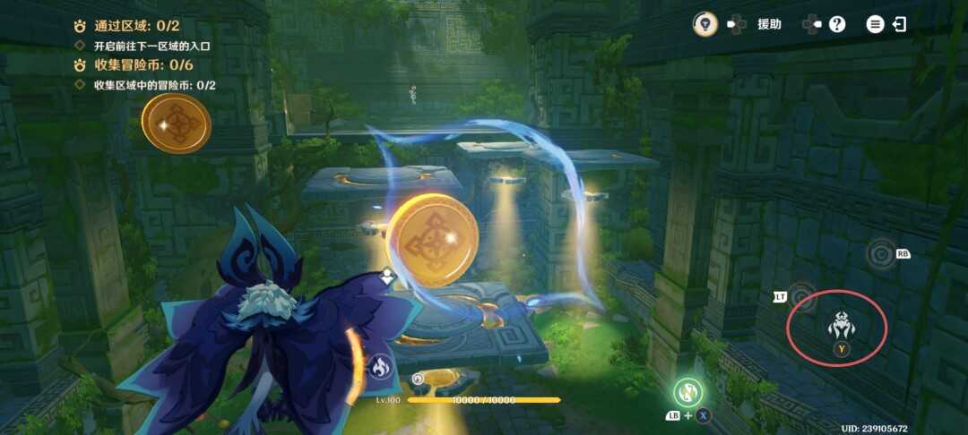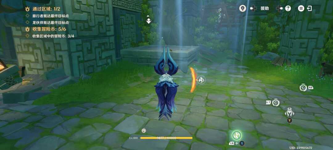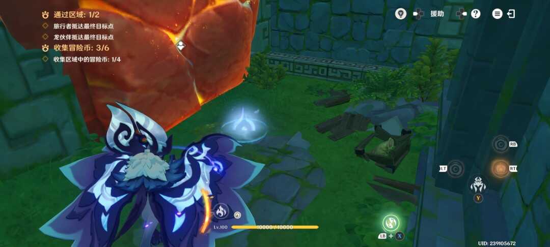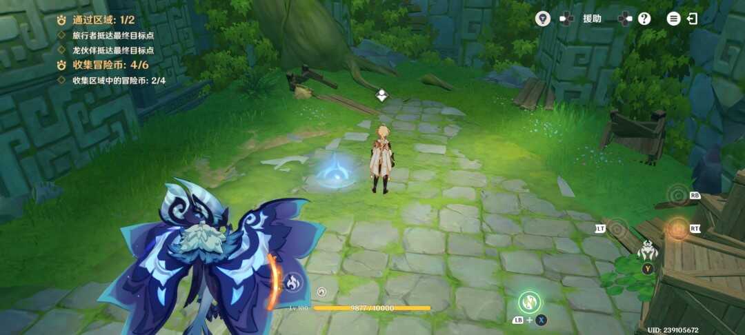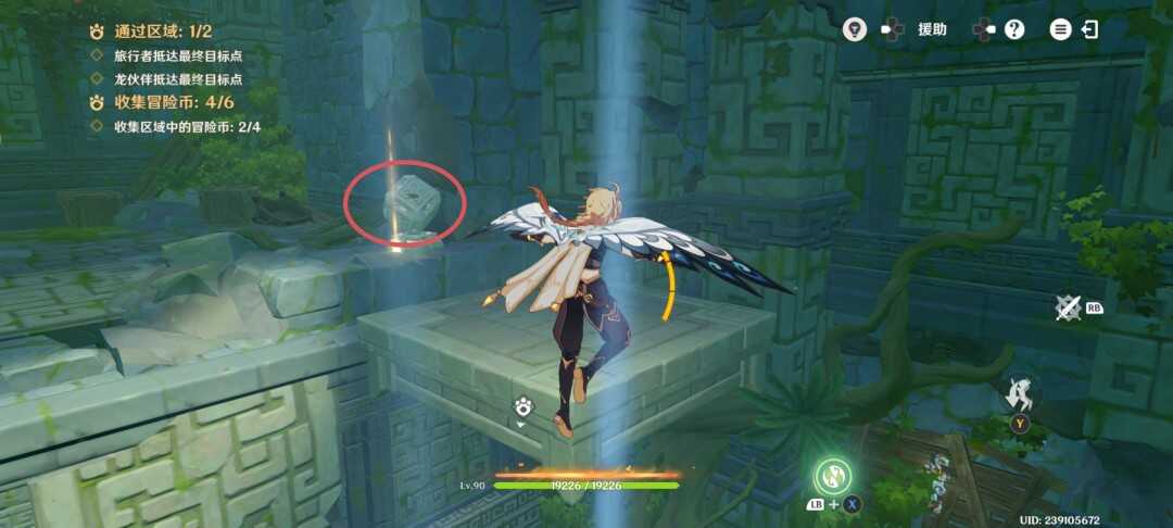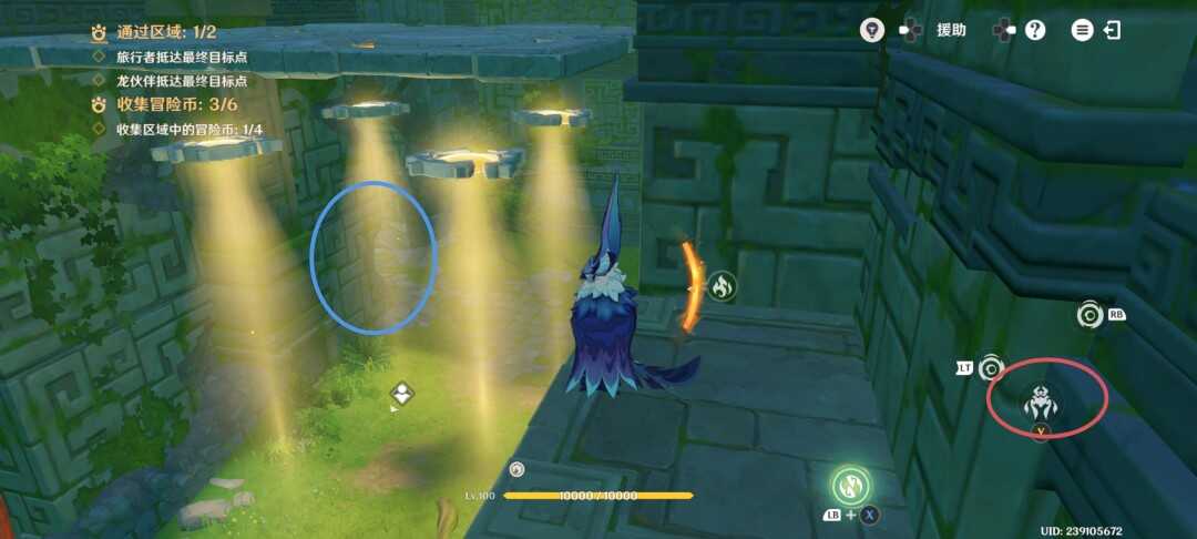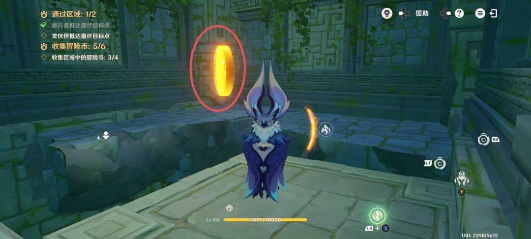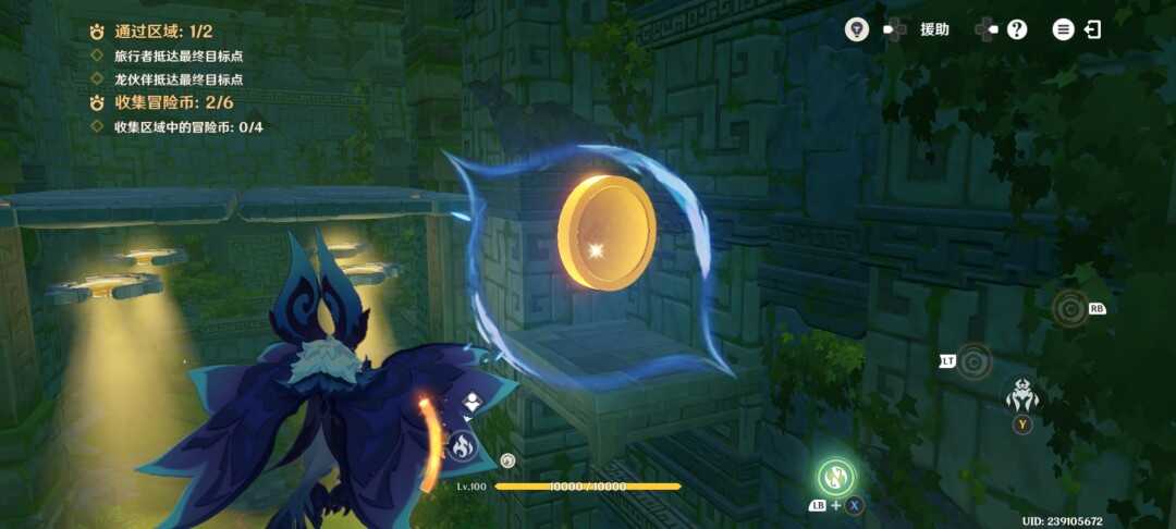 紧接着视角切换瞑视龙;移动到旅行者旁边,此处长按跳跃键即可高高跃起;利(li)用(yong)这(zhe)一能力拾取金幣,并在金幣的位置转动视角;