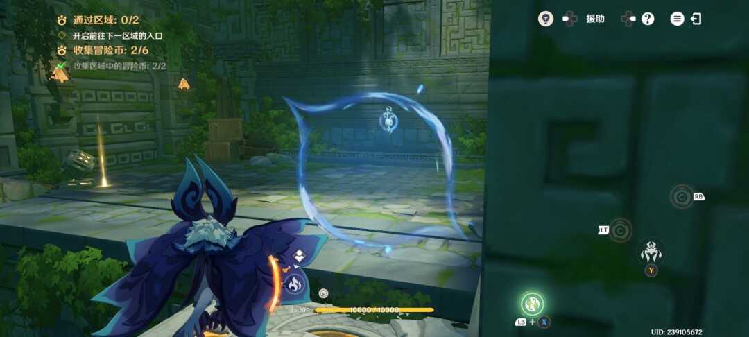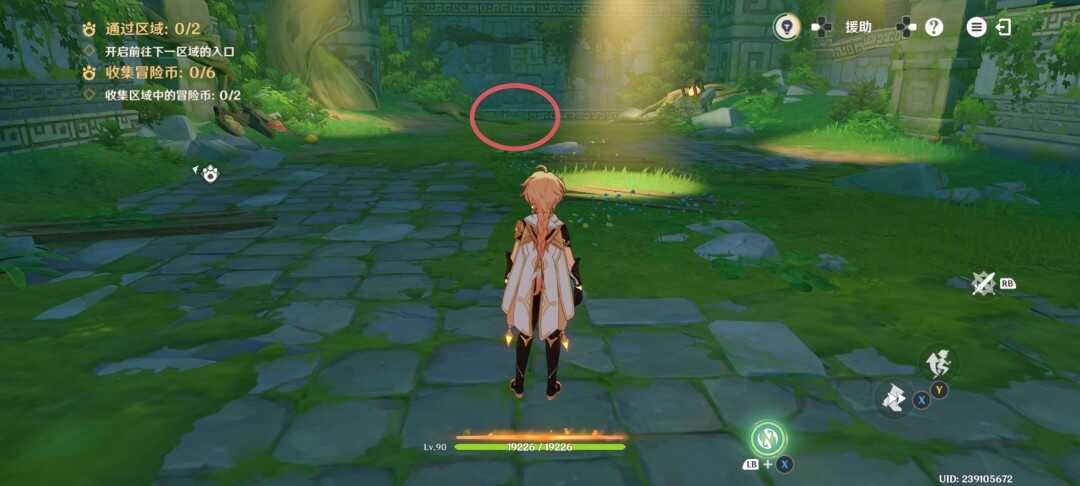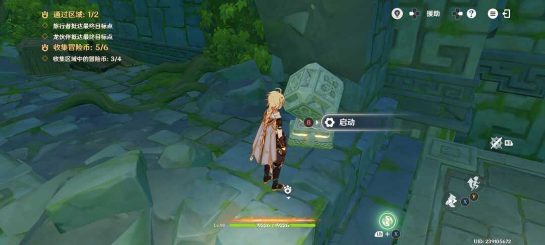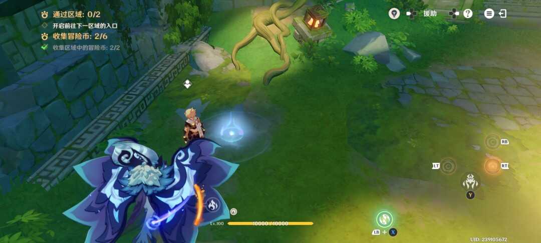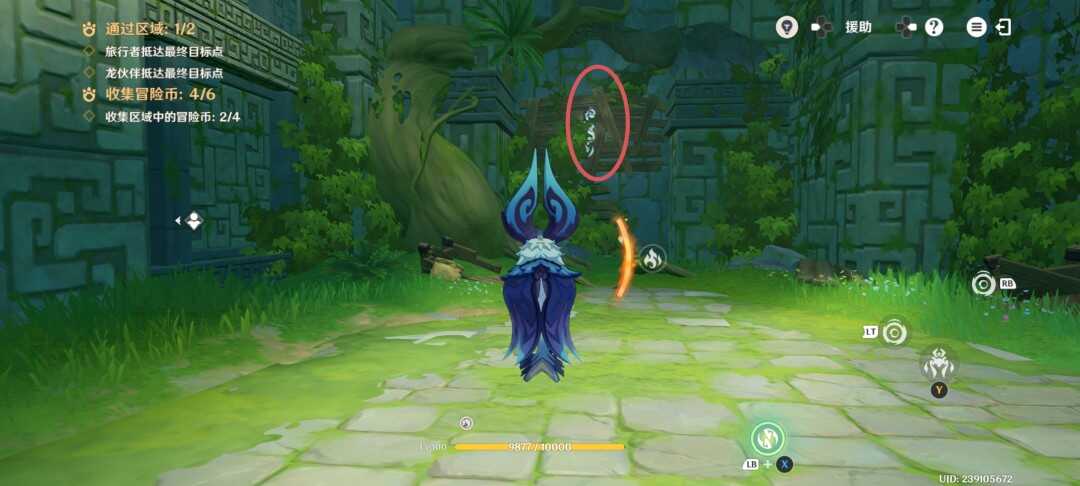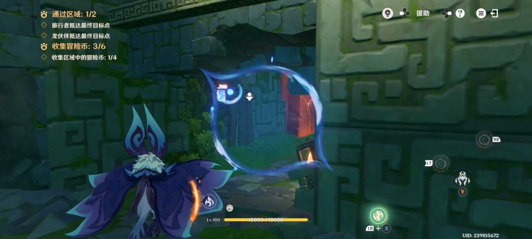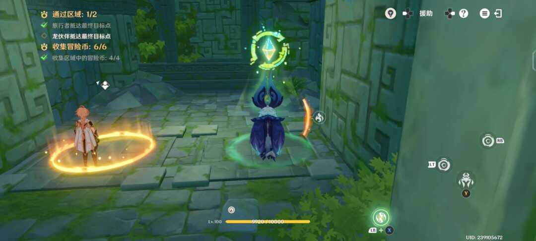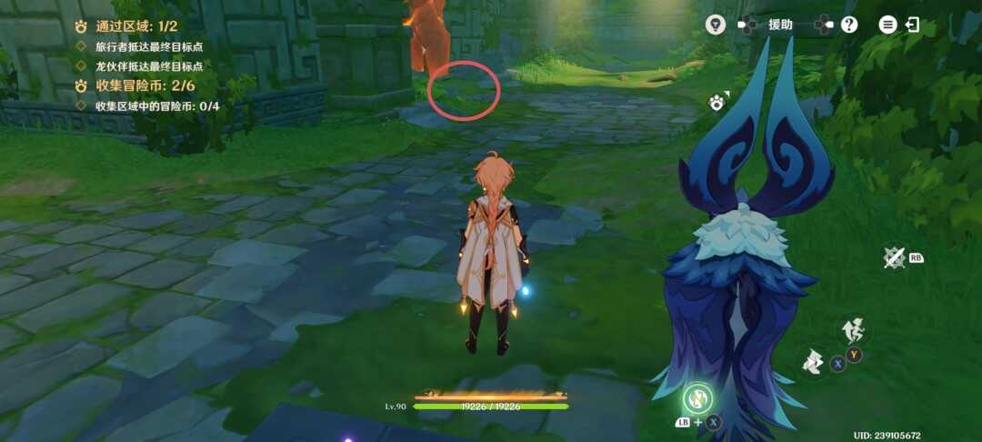 紧接着视角切换瞑视龙;移动到旅行者旁边,此处长按跳跃键即可高高跃起;利(li)用(yong)这(zhe)一能力拾取金幣,并在金幣的位置转动视角;