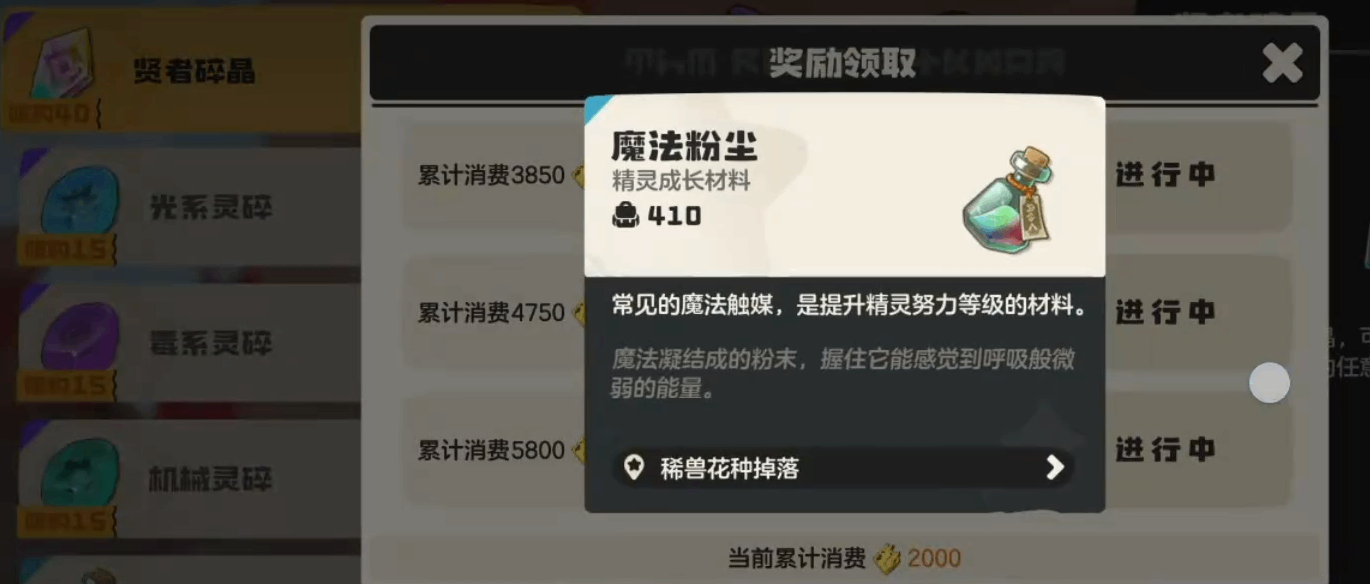 王国城堡(castle)附近还有一个精灵道具店。这个位置稍微远一点,不过也不(nor)难找。从地图上看王国城堡(castle)的区域,周边会标注有精灵道具店的图标。这个店同样设置了消费里程碑奖励,機製和前面两个店是一样的。累计消费到了就能领,里(li)面的魔法粉尘数量也够用。