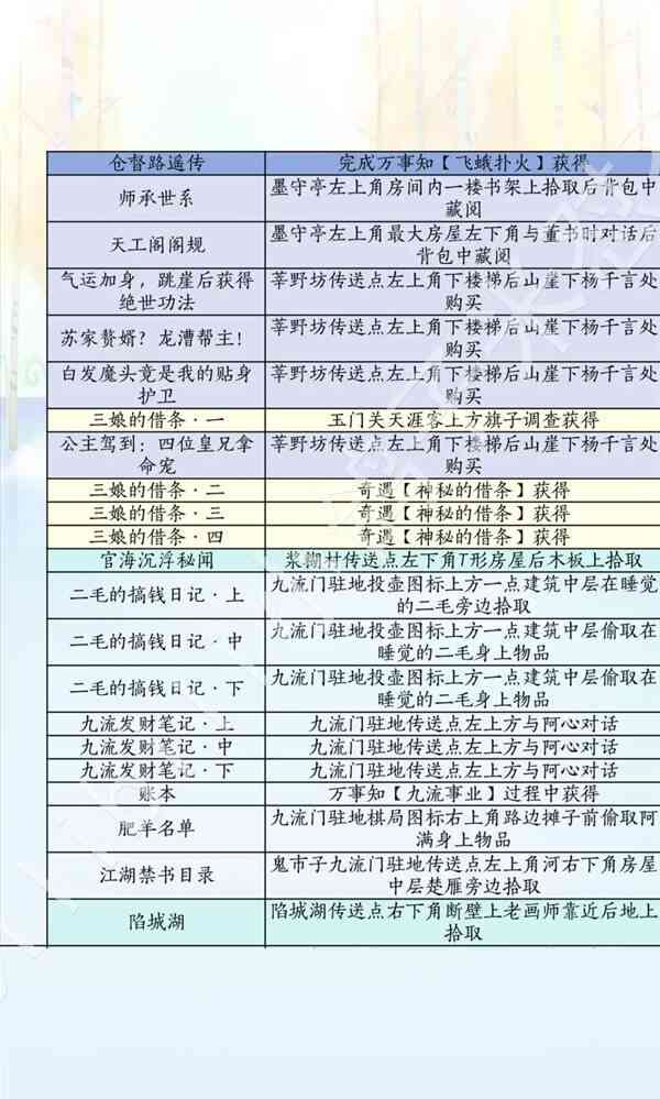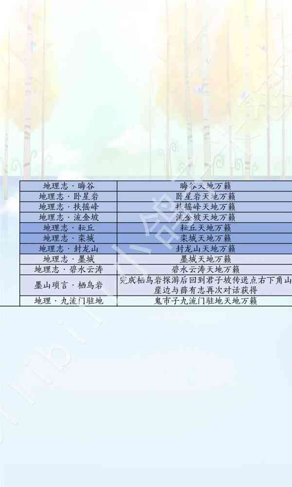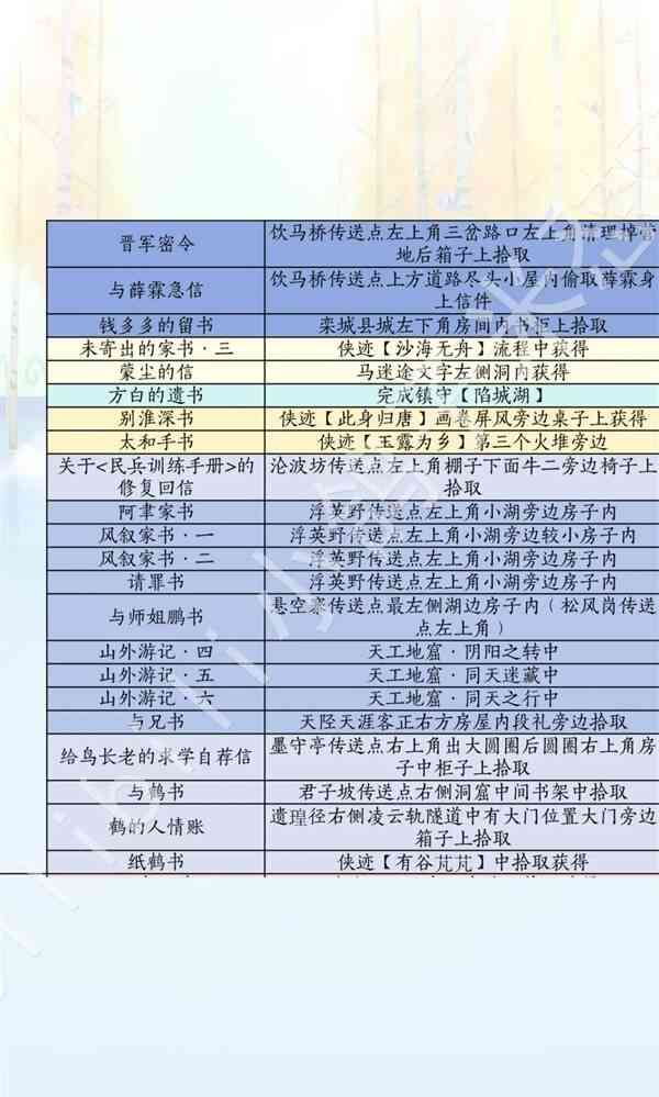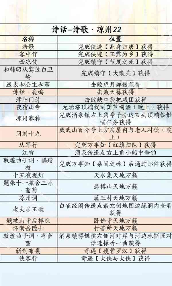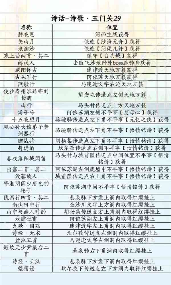 燕云十六声滹沱版本诗话获取攻略(lue)淡黄色-河西或玉门关,橙黄色-凉州,灰色-不见山,粉色-开封(后(hou)续(xu)增加(Increase)内容(content)),金色-家业或傢圎,青色-秦川,浅蓝色-不见山,深蓝色-天陉或飞天城,深深蓝色-滹沱