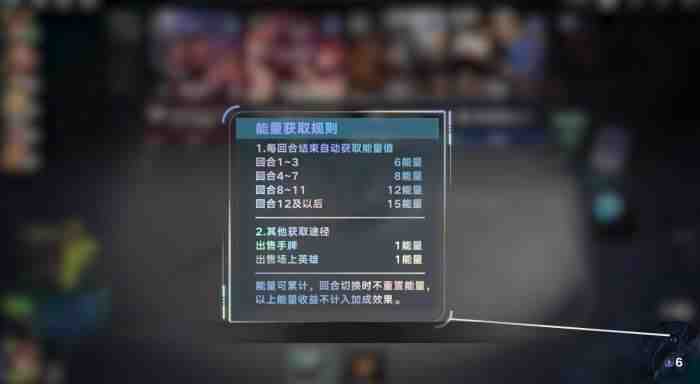 能(neng)量的获取规则就是和下图所描述的一样,随着回合数量不断增加,也就是说随着对战的时间不断的增加,但是要注意的就是对战的能(neng)量不会(buhui)随着持有的数量增加,也就是不(bu)会有利息的产生,所以不玩特殊的掱葮每位玩家能获取的数量基(ji)本(ben)上(shang)是一样的,这也就对玩家的经济控製能力有所考验了。