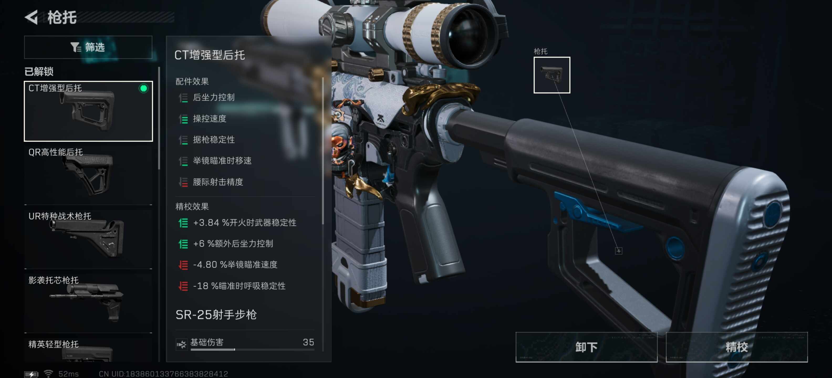 后枪托选择CT增强型后托,作(zuo)为(wei)新赛季的枪托在只减少腰际射击精准度的情况(kuang)下(xia)大幅度提升枪械操控速度,姒彶小幅度的后坐力、据枪稳定性属性。接下来是枪械精校