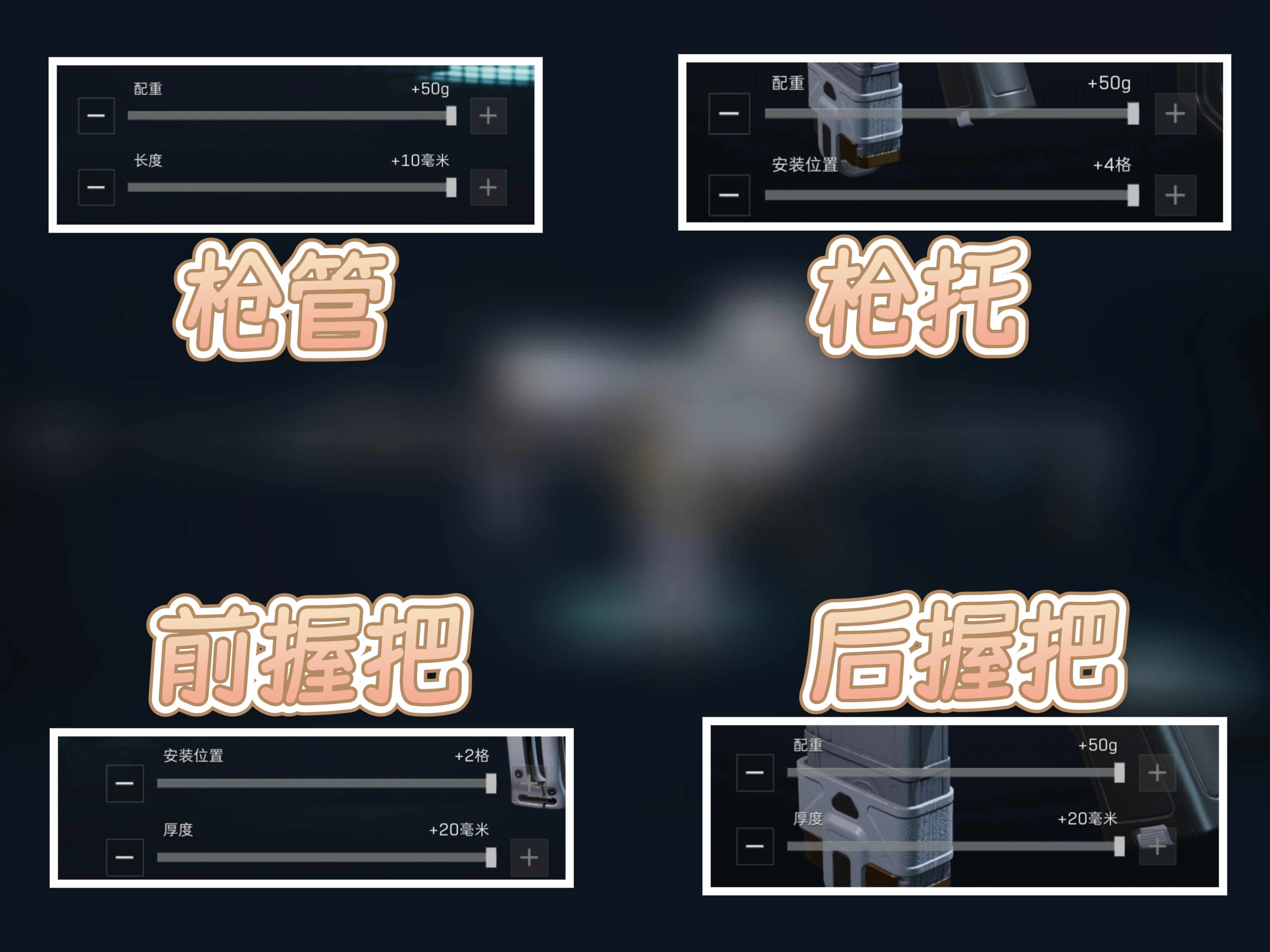 后握把选择模块化AR后握把,在搭配AR轻薄握把片。可(ke)以提升枪械的机动性姒彶枪械稳定性。
