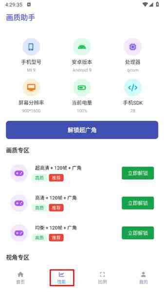 6、在性能板块可查看手机型号、处理器等,解锁对应的画质