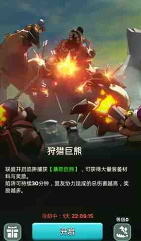 联盟开启陷阱捕获【暴怒巨熊】,可获得大量(a lot)装备材料与奖励。陷阱可持续30分钟,盟友协力造成的总伤害越高,奖励越多。