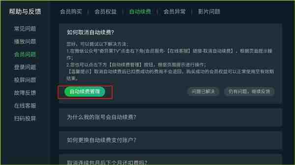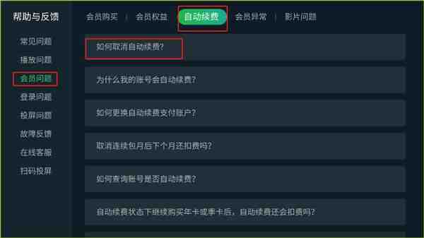 3、进入(jinru)問題与反馈后,点击会员(member)問題,选择(ze)自动续费,最后点击如何取消自动续费;