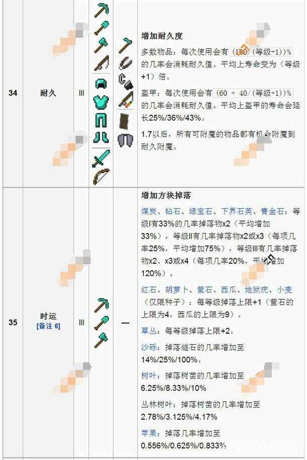 ③时运等级Ⅰ-Ⅲ这个作用在采矿过程中真是太喜欢,时运附魔可以大大增加矿石的掉落~除了矿石外,还可以加大西瓜、小麦、萝卜、苹果这些食物的掉落。可以附魔上此魔咒的物品,同上一条~
