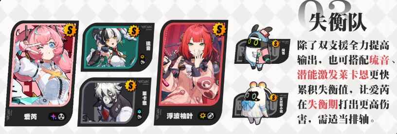 爆发输出的模式核心思路主要以搭配【击破】角色为主,「爱芮」可通过双连携的方式快速获取【应援能量】,因此击破速率越快的角色会更为契合「爱芮」的输出模式,可选择「青衣」、「琉音」、补强后的「莱卡恩」这类击破速率较快的角色,同时也能够提供一定增益;(「琉音」虽无法(can~t)触发【额外能力】的增伤,但本身可赠送的【终结技】可加快【应援能量】的获取,也一定程度上提高了「爱芮」的输出能力,整体上還湜比较适配的)