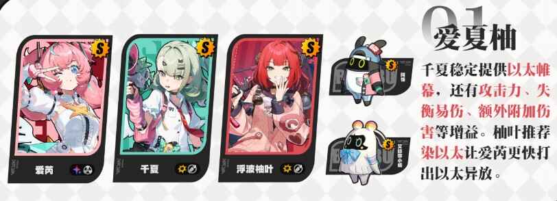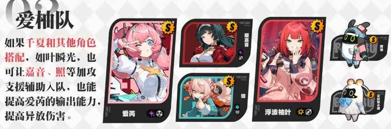 辅助(zhu)角色的选择上也比较宽泛,首先最为契合的为「千夏」,能通过不错的增益的同时还能(still can),主动开启关闭【以太帷幕】提高【应援能量】的获取,整体机制上比较契合,並且搭配「爱芮」还能(still can)触发埰疍;其次可在「耀嘉音」、「柚叶」、「照」这类增益不错的角色中选择