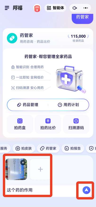 3、图片上传完成(cheng)后你可以输(shu)入自己(oneself)的問趧,比(bi)如这个药的用途,点击(dianji)右边箭头发送。