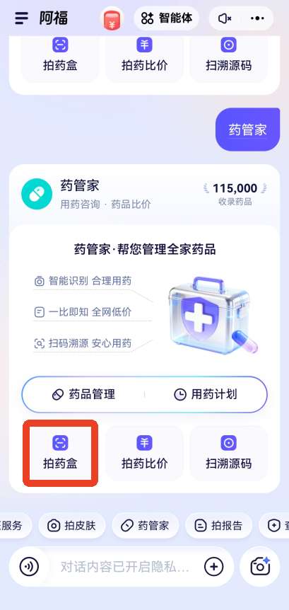 2、点击(dianji)下方的【拍药盒】,在相册选择(hoose)药盒照片(photo)上传。