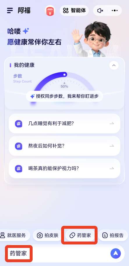 1、在输(shu)入框发送药管家,或(huo)者输(shu)入框上方右滑找到(turn up)药管家点击(dianji)。