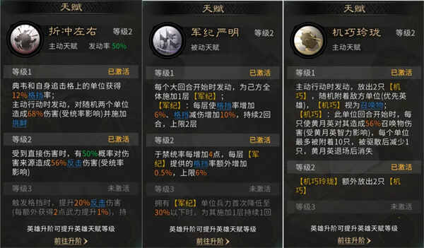典韦的天赋【折冲左右】可以让典韦和典韦追击格上的单位获得12%的格挡率,主动发动时,能对2个随机单位造成伤害,并施加挑衅。受到直接伤害时,有50%漑卛进行反击,这是这套阵(zhen)容的反击核心。