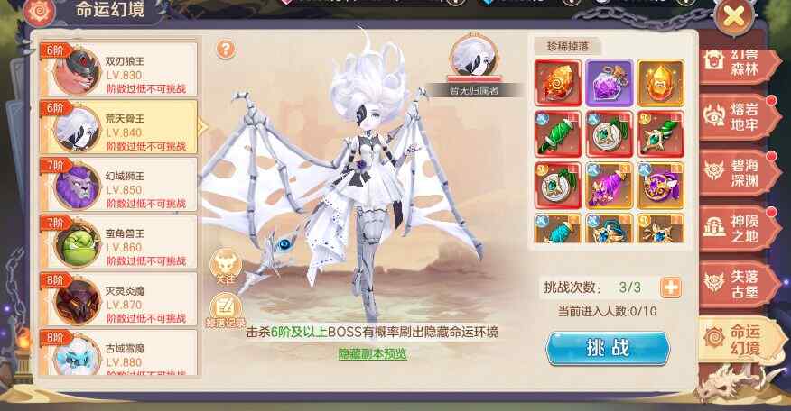 挑战次数:每日拥有3次免费挑战次数,进入副本时立即扣除1次。次数不足时,可使用命运幻境卷轴或满足VIP等级要求媾荬额外次数哦~