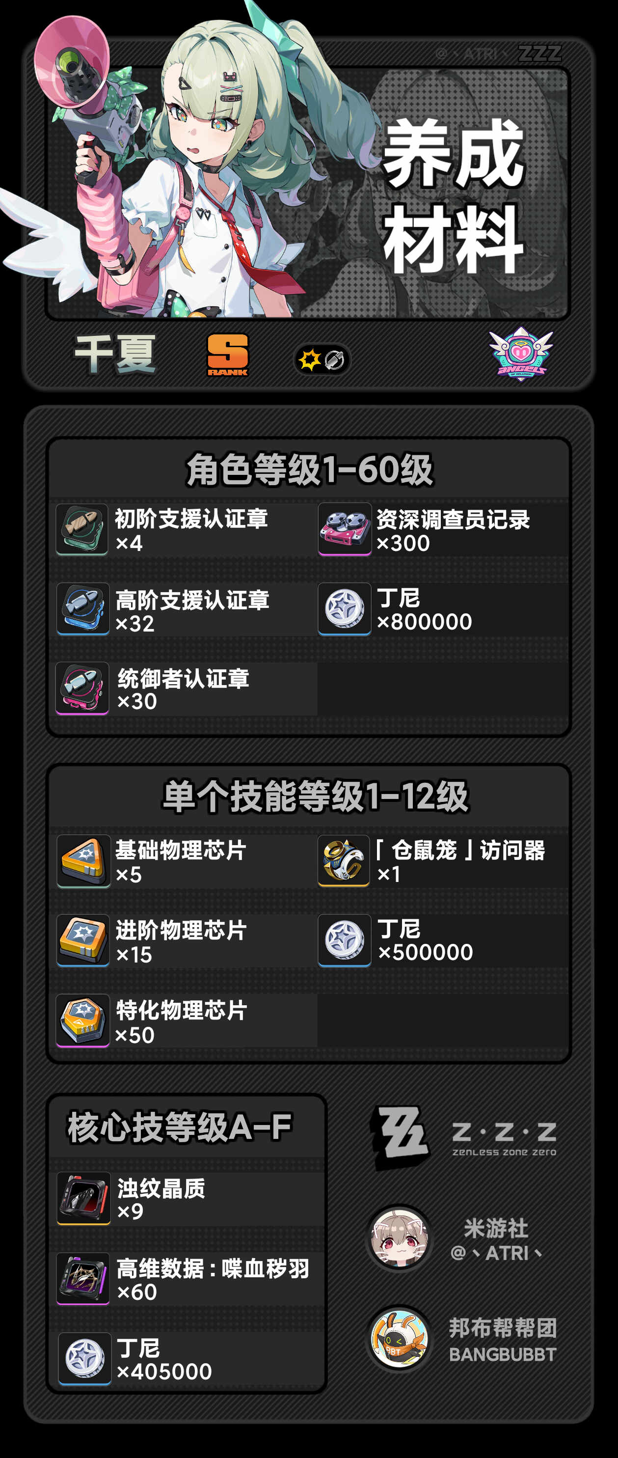 此次小编给大家分享的绝区零千夏角色养成材料指南最新教程,有不清楚的或是想了解绝区零千夏角色养成材料指南更多相关的小伙伴,请关注小编以获取第一时间的资讯更新信息。