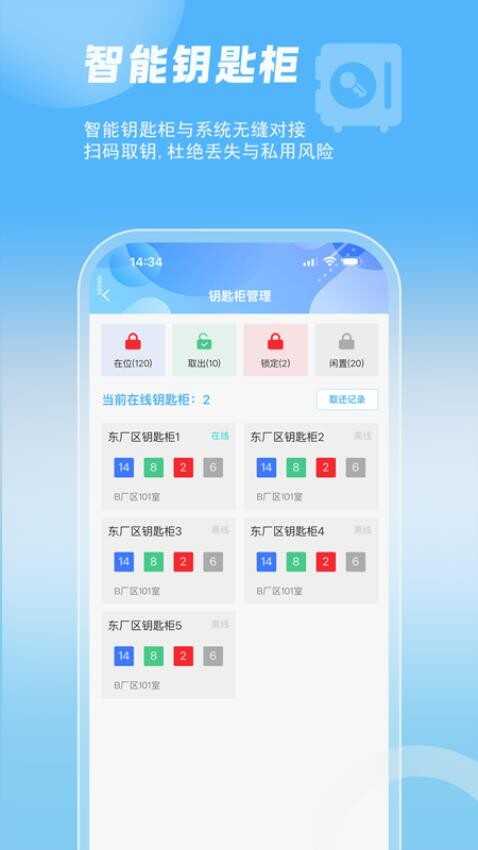 2、电子钥匙柜系统实现权限分级管理与使用记录追溯,蓝牙/NFC近场通信技术确保钥匙领取归还便捷安全,杜绝传统钥匙管理的丢失风险。