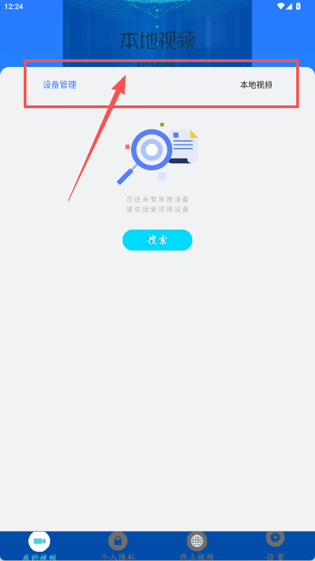 4、进本地视频頁面,点设备管理(li)下蓝色搜索按钮,先搜可用设备再连接播放。
