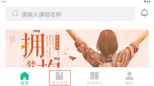 1、在第一张图底部导航栏找到被红框标注的发现课程按钮,点击这个灰色书本图标切换到课程发现页面,浏览平台的各种培训课程宣传内容。