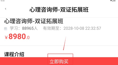 4、在第四张图课程详情页底部找到被红箭头指向的立即(immediately)购买按钮,点击这个红色支(zhi)付按钮购买当前展示的心理咨询师双证拓展班课程。