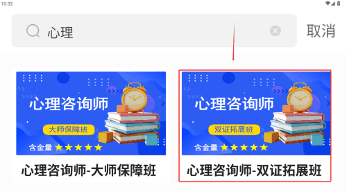 3、在第三张图右侧课程广告条中找到被红框和箭头指向的双证拓展班课程卡片,点击这个蓝色背景的广告查看心理咨询师培训班的详细信息。