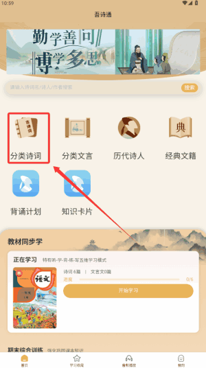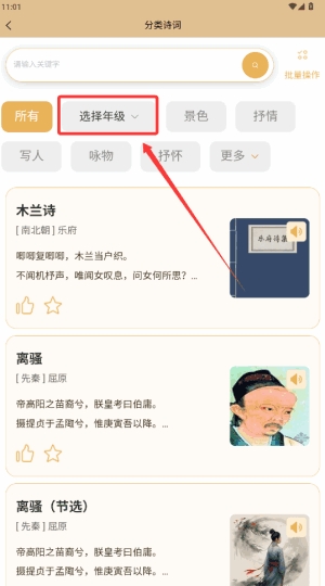 2、在第二张图分类诗词页面顶部找到被红框标注的选择年级标签,点击这个标签可以按小学初中高中不同学段筛选适合的诗词内容。