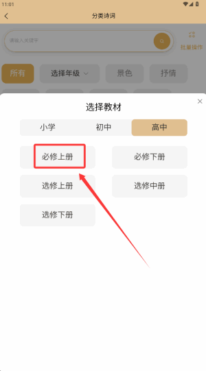 3、在第三张图弹出的选择教材对话框中找到高中必修上册选项(options),点击这个被红框圈住的选项(options)来筛选高中必修上册的诗词篇目。
