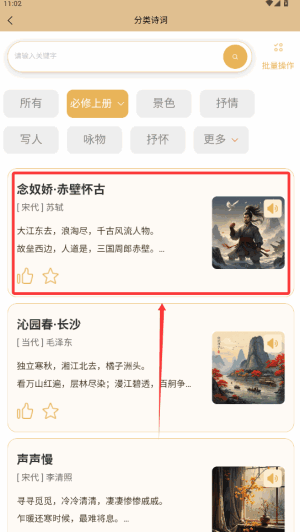 4、在第四张图诗词列表中找到苏轼的念奴娇赤壁怀古,点击这个被红箭头指向的诗词条目查看(kan)完整内容并收听朗读音频。
